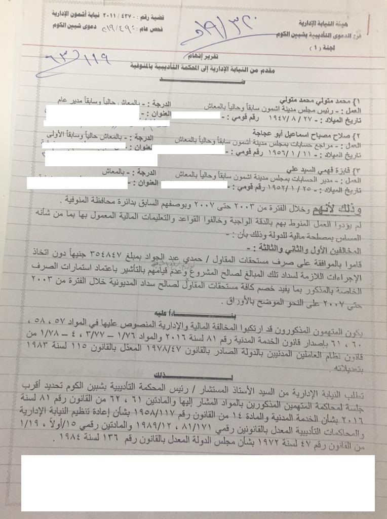 قرار الإحالة للمحاكمة التأديبية شمل كلًا من محمد متولي محمد، رئيس مجلس مدينة أشمون وصلاح مصباح إسماعيل، مراجع الحسابات بمجلس المدينة وفايزة فهمي السيد، مديرة الحسابات