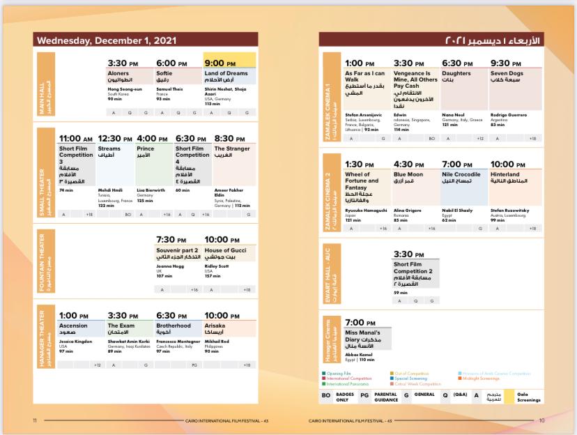 تتواصل عروض وفعاليات الدورة الـ43 لمهرجان القاهرة السينمائي الدولي، المقامة بساحة دار الأوبرا المصرية، حيث يشهد اليوم الأربعاء، سادس أيام المهرجان، العديد من العروض، على عدة مسارح بدار الأوبرا وسينما الزمالك وباقى دور العرض الأخرى، حيث يعرض عدد من الأفلام فى مواعيد عرضها الأول عالميًا أو في أفريقيًا أو عربيًا، كما يتضمن الجدول عدة حلقات نقاشية مع صناع السينما والدراما.