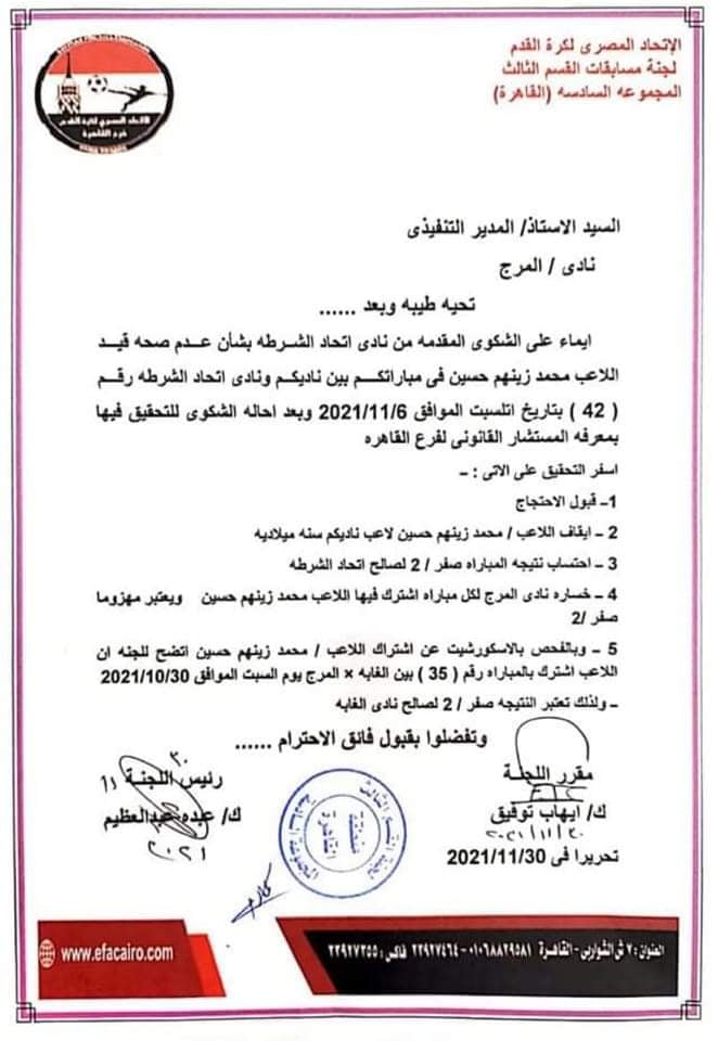 قررت لجنة مسابقات المجموعة السادسة لمسابقة دوري القسم الثالث بقيادة عبده عبدالعظيم، اعتماد فوز الشرطة على المرج 2-0 اعتباريا بعد قبول احتجاج النادي البوليسي ضد عدم صحة قيد لاعب المرج.