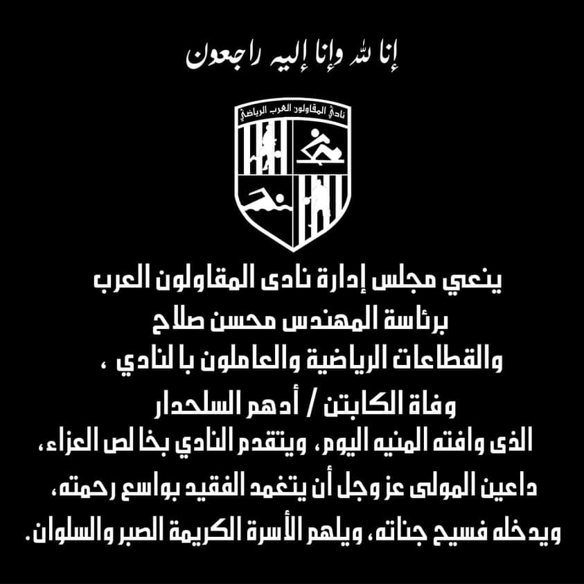 نعى مجلس إدارة نادى المقاولون العرب برئاسة المهندس محسن صلاح، والقطاعات الرياضية والعاملون بالنادي، الكابتن ادهم السلحدار، لاعب الإسماعيلي السابق والمدير الفني لفريق المجد السكندري والذى وافته المنية مؤخرا.