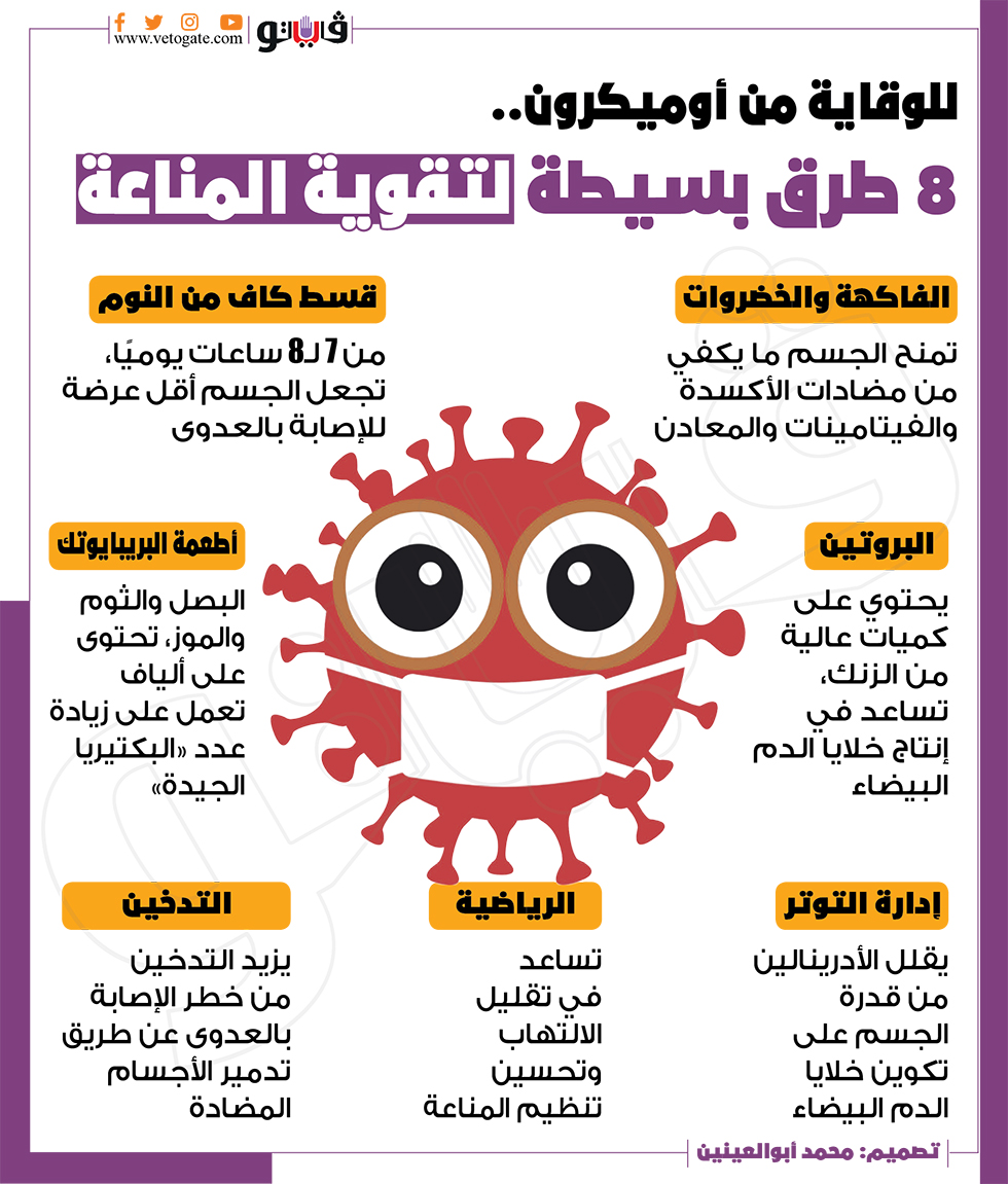 للوقاية من أوميكرون.. 8 طرق بسيطة لتقوية المناعة | إنفوجراف السبت 04/ديسمبر/2021 - 03:02 م 12/4/2021 3:02:10 PM طرق بسيطة لتقوية المناعة شارك طباعة 18 حجم الخط شارك طباعة