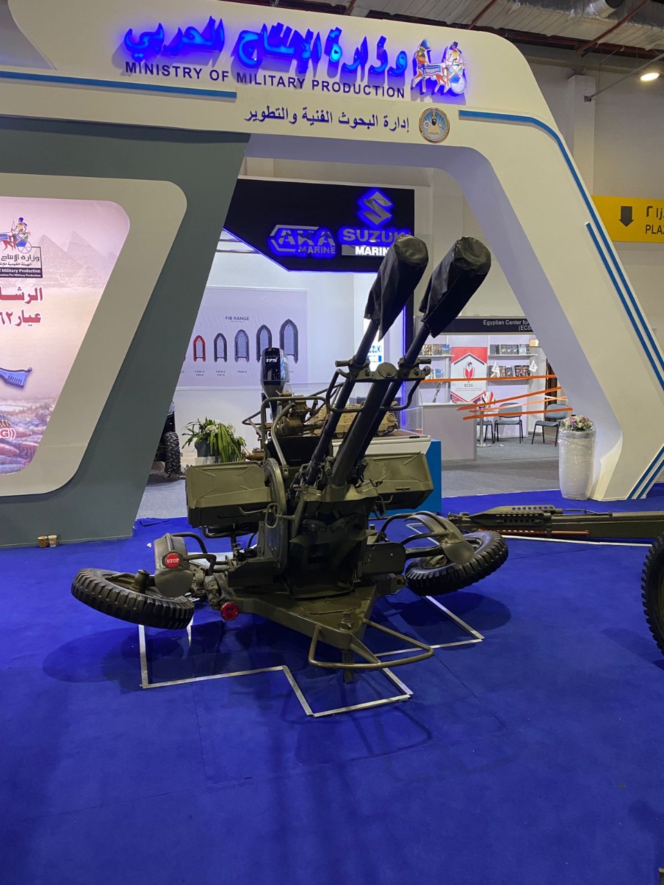 ومن معروضات الإنتاج الحربي في "EDEX 2021" المدفع الثنائي المضاد للطائرات زد يو (عيار 23 مم)، وتبلغ أقصى سرعة للتحرك 70 كم/ساعة، ومداها (أرضية 2000-2500 م) وأهداف جوية (1500-2000 م)، والوزن الإجمالي للمدفع والعربة 950 كجم ووزن الرشاش كامل "ماسورة واحدة" يبلغ 75 كجم، ويتكون طاقمها من 5 أفراد، ويصل معدل الرمي إلى 400 طلقة/دقيقة، الذخيرة: 23×152 مم، بعدد (2) ماسورة، ويبلغ زمن الإعداد للضرب 30 ث، وعدد الطلقات (100) طلقة، ونوع الذخيرة المستخدمة هو خارق للدروع كاشف API-T وشديد الانفجار HEI-T بجهاز رؤية ميكانيكي وتليسكوب للأهداف الأرضية، ويعمل المدفع بتأثير الغاز ونظم إحكام قفل ميكانيكي للترباس ونظم طرق ميكانيكي للكبسولة إلى جانب نظم تغذية للطلقات بواسطة الشريط ونظم تبريد هوائي للماسورة.