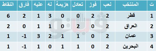 وشهدت مباريات المجموعة الأولى تعادل العراق مع عمان 1-1، وفوز قطر على البحرين 1-0 في الجولة الأولى.