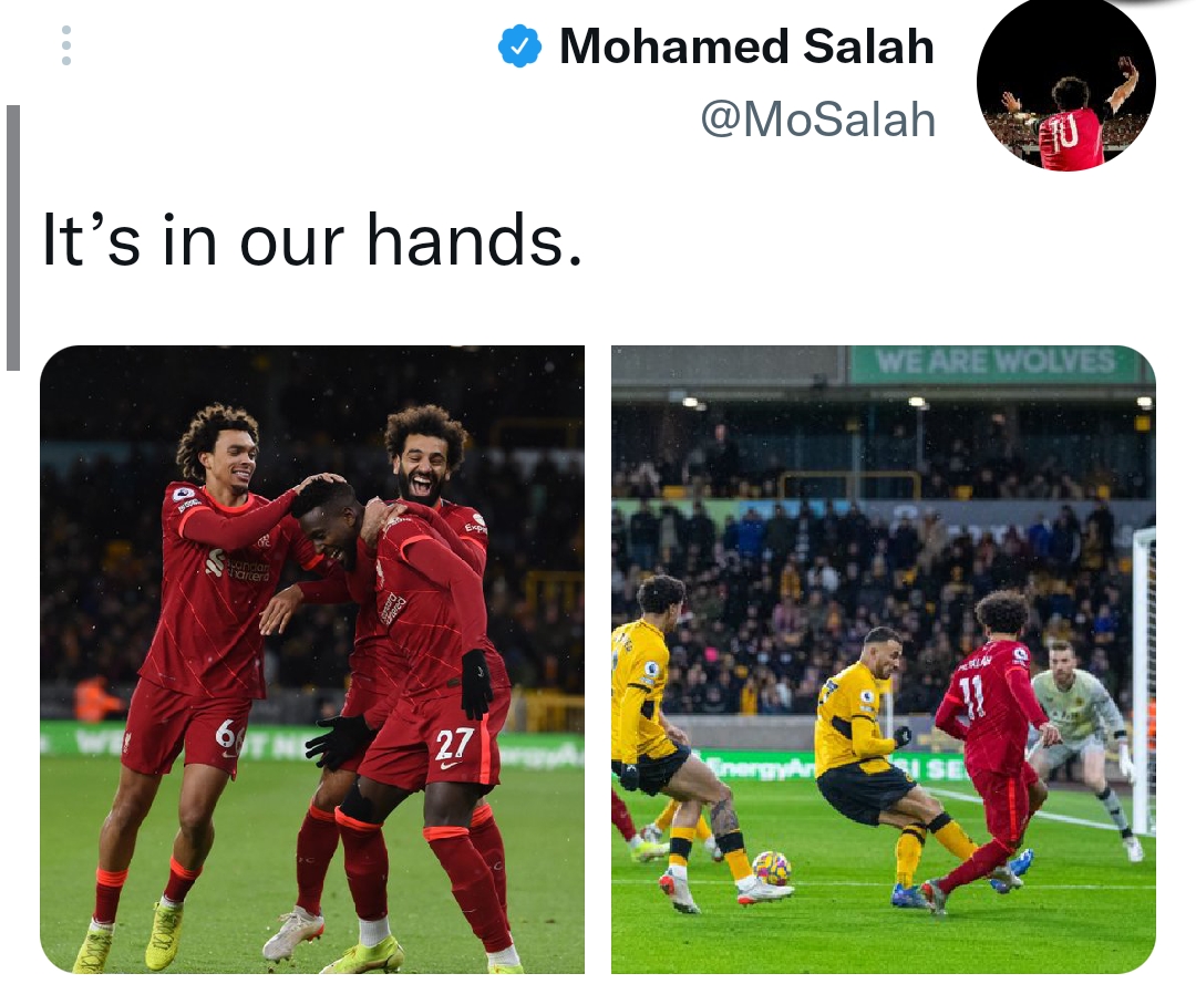 وكتب صلاح تغريدة له عبر حسابه الشخصي على موقع التدوينات القصيرة تويتر: "إنها في أيدينا".