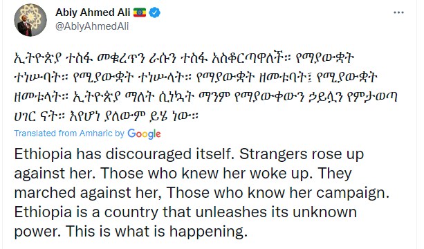 وكتب آبي أحمد تغريدة على تويتر قال فيها "ثبطت إثيوبيا من عزيمتها. وثار الغرباء ضدها. أولئك الذين عرفوها استيقظوا. وهؤلاء الذين يعرفون حملتها العسكرية والسياسية ساروا ضدها. إثيوبيا بلد يطلق العنان لقوته المجهولة. وهذا ما يحدث".