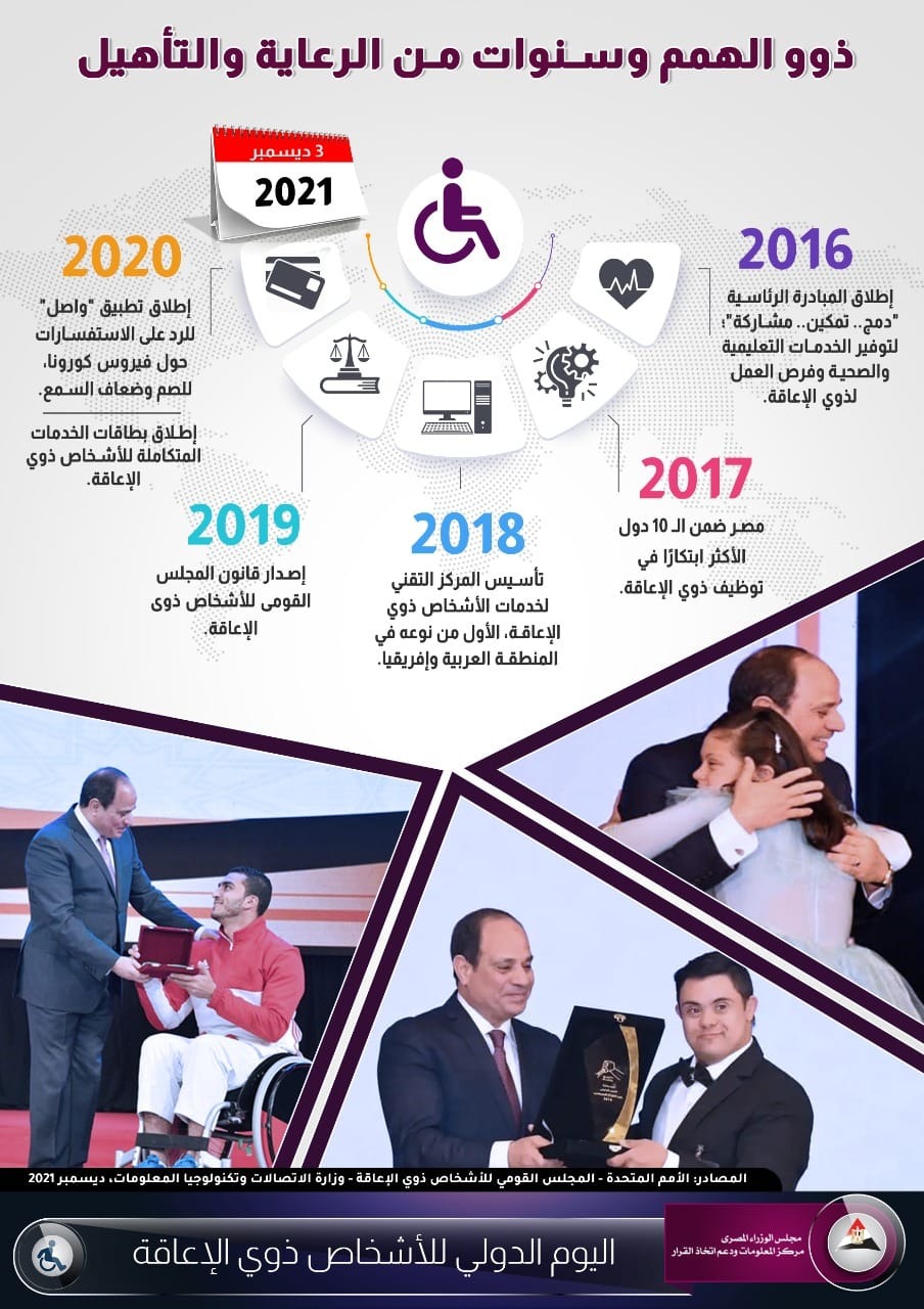 وأصدر مركز المعلومات ودعم اتخاذ القرار بمجلس الوزراء، إنفوجرافًا تحت عنوان " ذوو الهمم وسنوات من الرعاية والتأهيل"، ليستعرض من خلاله جهود الدولة في دعم ورعاية هؤلاء الأشخاص.