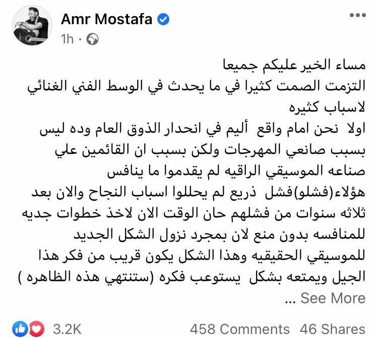 علق المطرب والملحن عمرو مصطفي على ما يحدث في الوقت الحالي على الساحة الفنية، وذلك من خلال حسابه الشخصي عبر موقع "فيس بوك".