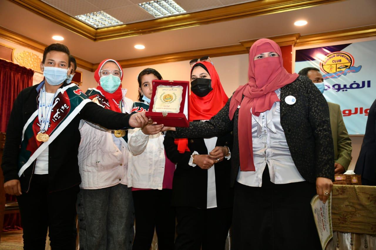 أهدى محافظ الفيوم إلى كل منهم شهادة تقدير ودروع التميز، وهم علا صابر من "قرية النزلة" الفائزة بمسابقة جوجل العالمية وجائزتها 500 ألف دولار ضمن أفضل 100 طالب وطالبة على مستوى العالم، وأميرة شعبان من "قرية النزلة" التحقت بكلية طب جامعة الفيوم من فصول محو الأمية، وقرنى على عبد التواب من قرية "سنهور القبلية" عامل نظافة عُثر على 400 ألف جنيه وسلمها للشرطة.
