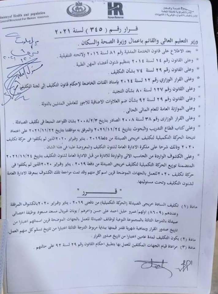 الصحة تعتمد حركة تكليف الصيادلة دفعتي ٢٠١٩ و٢٠٢٠