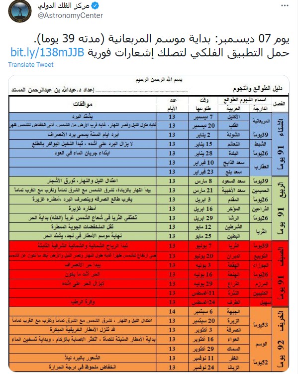 وكتب المركز الدولي للفلك تغريدة عبر تويتر: "يوم 7 ديسمبر: بداية موسم المربعانية (مدته 39 يوما).