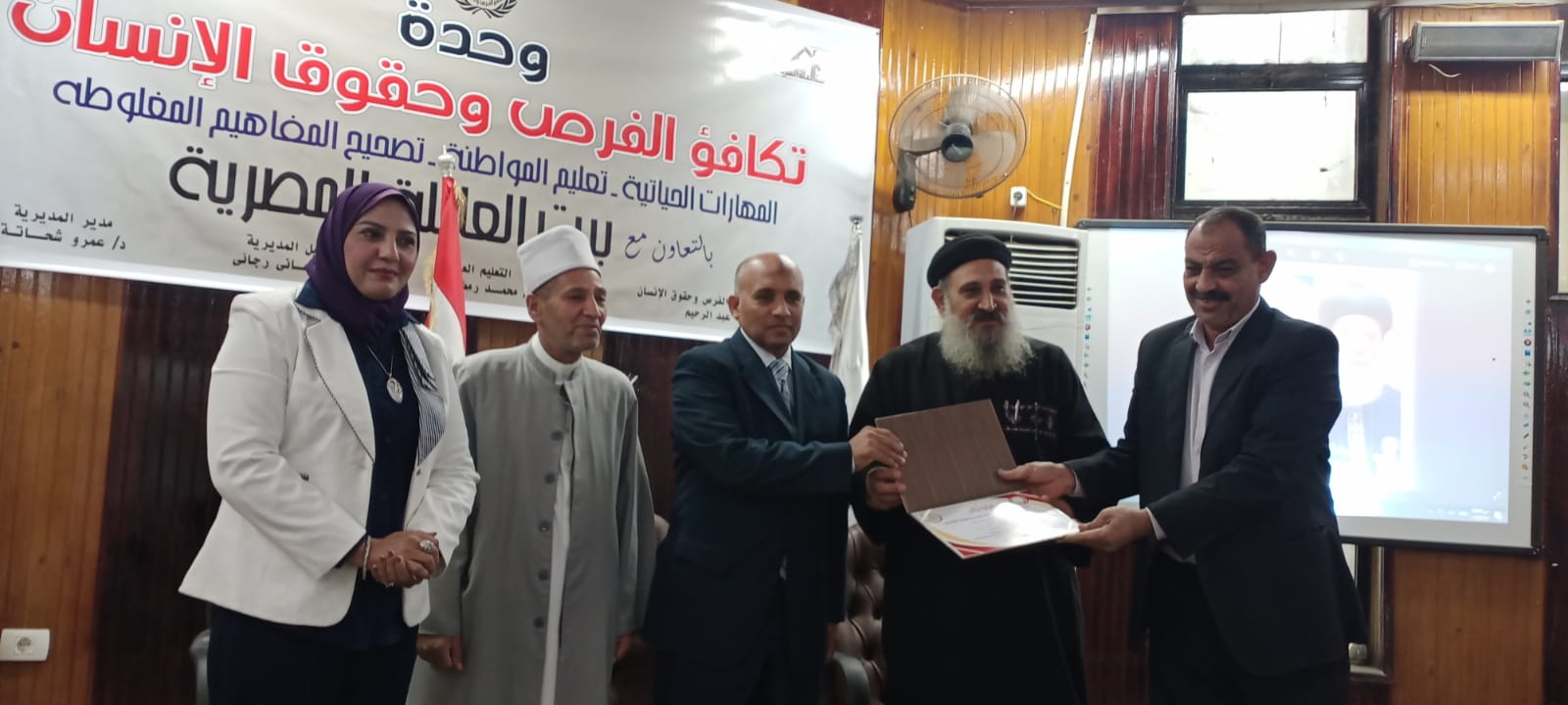نظمت وحدة تكافؤ الفرص وحقوق الإنسان بمديرية التربية والتعليم بــ بني سويف، تحت رعاية عمرو شحاتة وكيل وزارة التربية والتعليم، وتأكيده على أهمية دور المؤسسات الوطنية في تنمية الوعي لدى الطلاب ومواجهة التحديات، مؤتمرا، اليوم، بالتعاون مع بيت العائلة المصرية بقاعة المديرية تحت عنوان "المهارات الحياتية وتعليم المواطنة وتصحيح المفاهيم المغلوطة".