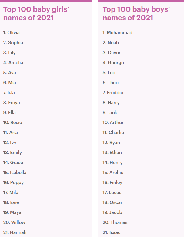 وكان من بين الخمسة الأوائل للفتيان محمد، وهو اسم من أصل عربى، بالإضافة إلى نوح وأوليفر وجورج وليو، وفي الوقت نفسه، كانت الأسماء المنتهية بالحرف "A" خيارًا شائعًا للفتيات، حيث احتلت أوليفيا وصوفيا المركزين الرئيسيين، تليهما ليلى وأميليا وآفا، كما أشار BabyCentre إلى أنه مع استمرار تفشي جائحة الفيروس التاجى، فإن شعبية بعض الأسماء تبرز بشكل خاص.