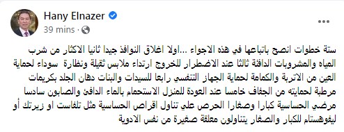 وكتب الدكتور هاني الناظر تدوينة على الفيس بوك "ستة خطوات انصح باتباعها في هذه الاجواء …اولا اغلاق النوافذ جيدا ثانيا الاكثار من شرب المياه والمشروبات الدافئة ثالثا عند الاضطرار للخروج ارتداء ملابس ثقيلة ونظارة سوداء لحماية العين من الأتربة والكمامة لحماية الجهاز التنفسي"