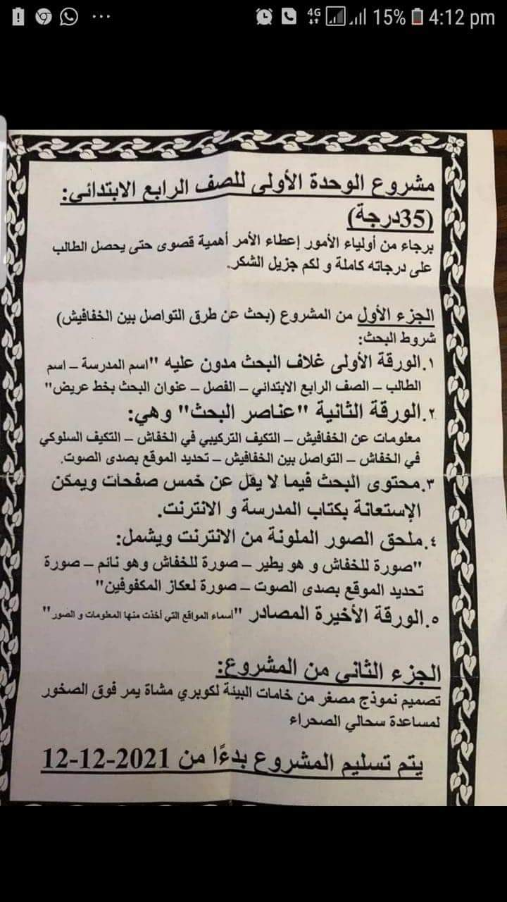 ومن جانبها نفت وزارة التربية والتعليم والتعليم الفني الصورة التي يتم تداولها عبر مواقع التواصل الاجتماعي المختلفة وبين جروبات أولياء الأمور والتي تخص تلاميذ الصف الرابع الابتدائي والتي تطالب أولياء الأمور بإجراء بحث مشروع الوحدة الأولى للطلاب لكي يحصل الطالب على درجاته كاملة.
