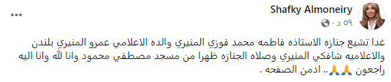 وكتب المسئول عن حساب الإعلامية شافكي المنيري عبر حسابها الشخصي بموقع التواصل الاجتماعي فيس بوك: غدًا تشيع جنازة الأستاذة فاطمة محمد فوزي المنيري، والدة الإعلامي عمرو المنيري بلندن، والإعلامية شافكي المنيري، وصلاة الجنازة ظهرا من مسجد مصطفى محمود، وإنا لله وإنا إليه راجعون.