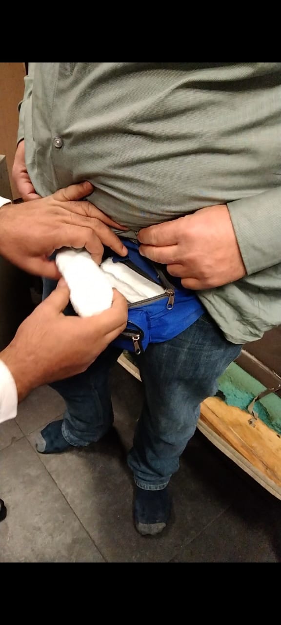 وبالعرض على الدكتور أحمد علي مدير الجمرك قرر تكليف أحمد عمر مأمور الجمرك بتفتيش الراكب ذاتيا تحت إشراف هانى أبوطالب مدير الصالة حيث عثر على ٨٥٠ قرصًا من مخدر من الترامادول مخبأة حول جسده وبين طيات ملابسه.