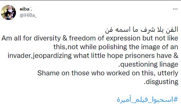 في هذا السياق، أشار بعض نشطاء تويتر إلى أن الفيلم لا يعبر عن الفن، وجاء التعليق على النحو التالي: الفن بلا شرف ما اسمه فن، نحن جميعًا مؤيدين للتنوع وحرية التعبير ولكن ليس هكذا، ليس أثناء تلميع صورة الغزاة، مما يعرض للخطر الأمل الضئيل لدى السجناء والتشكيك في النسب.. عار على أولئك الذين عملوا على هذا، مقرف تمامًا.