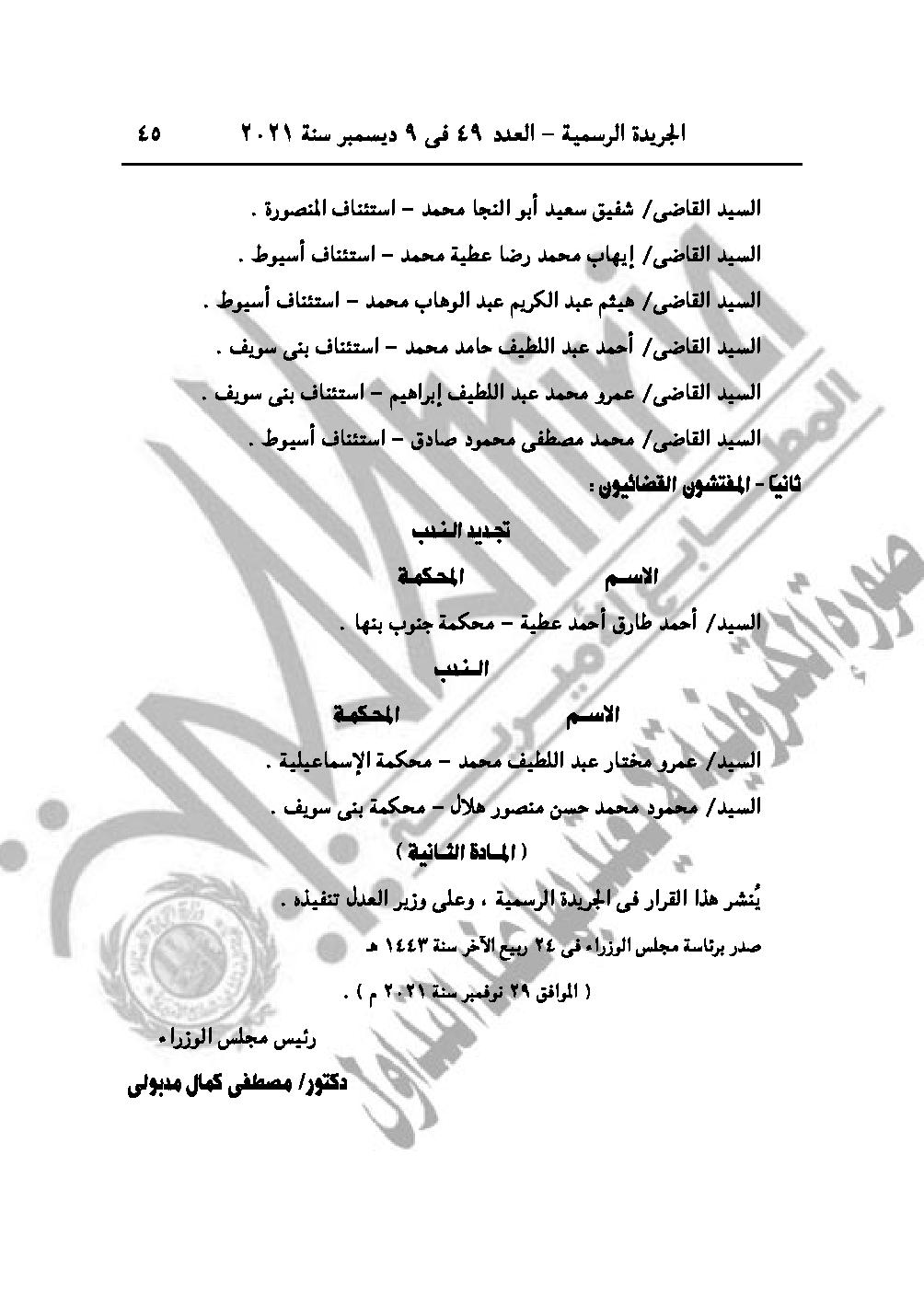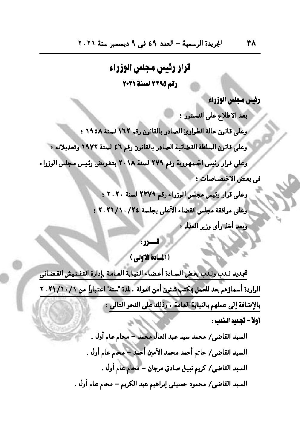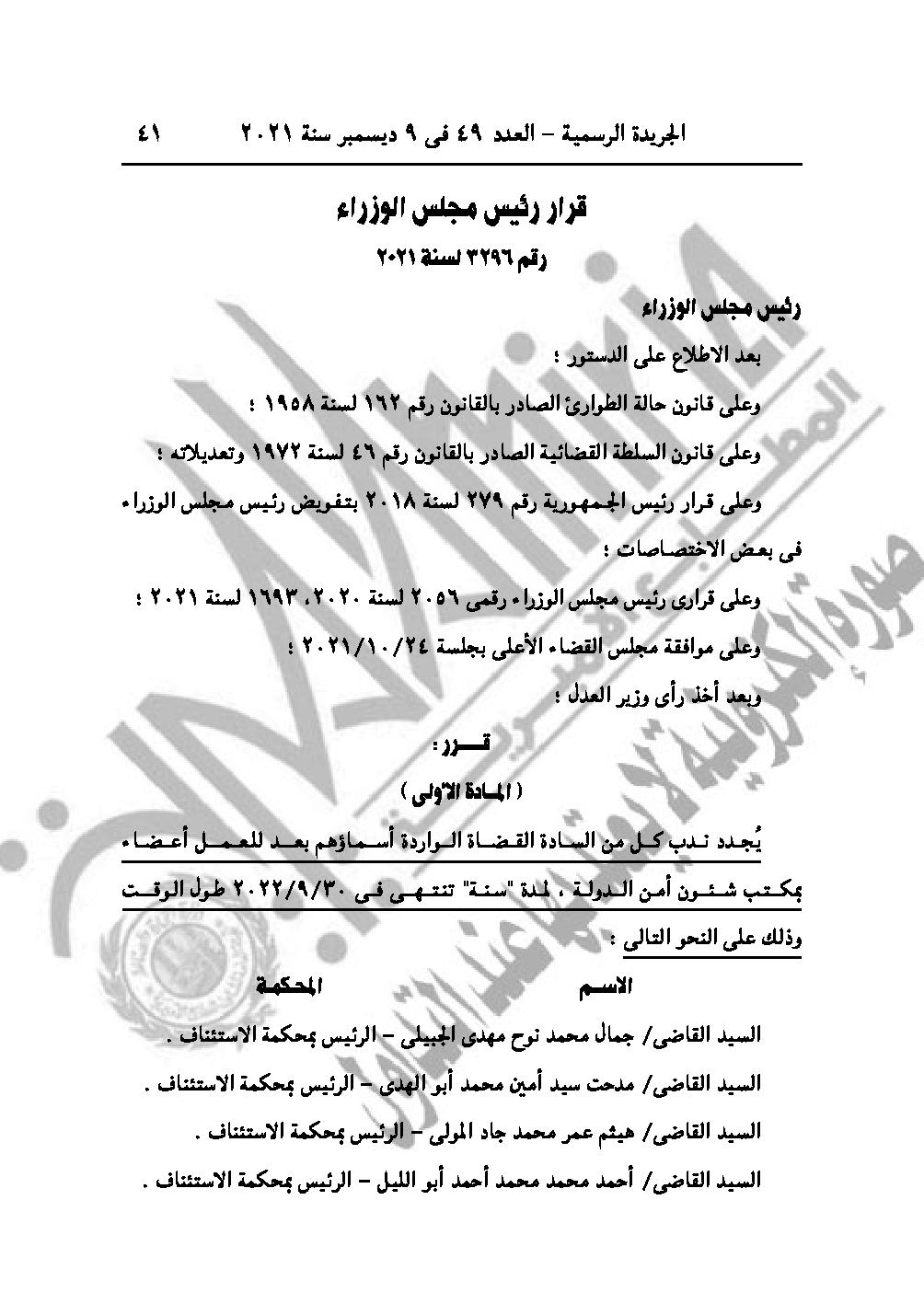 والقرار رقم 3296 لسنة 2021، يُجـدد نـدب كــل من القـضاة الــواردة أسـماؤهم بعـد للعمل أعضـاء بمكتب شئون أمن الدولة، لمدة "سنة" تنتهــي فـي 2022/9/30 طول الوقت.
