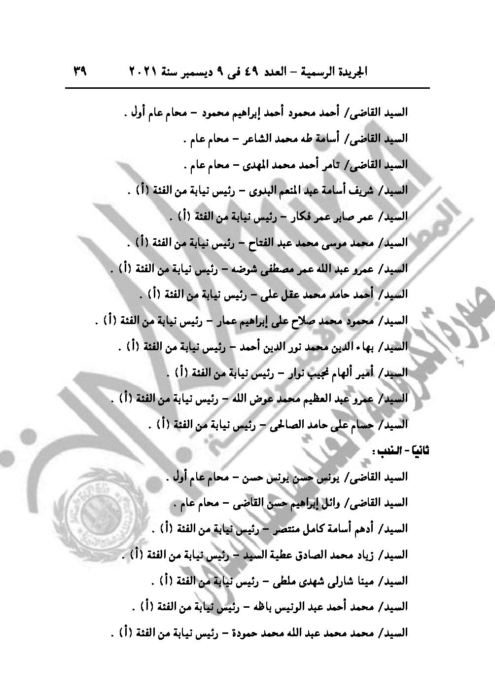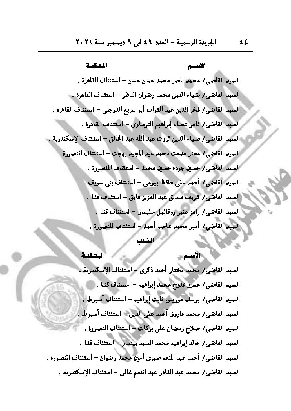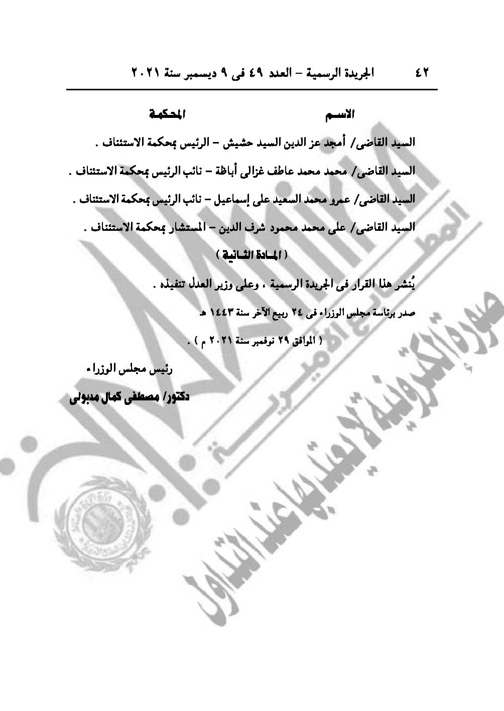 والقرار رقم 3296 لسنة 2021، يُجـدد نـدب كــل من القـضاة الــواردة أسـماؤهم بعـد للعمل أعضـاء بمكتب شئون أمن الدولة، لمدة "سنة" تنتهــي فـي 2022/9/30 طول الوقت.