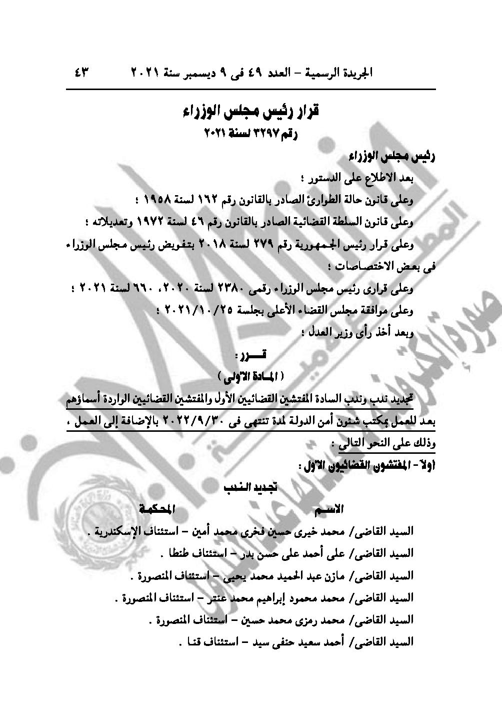 والقرار رقم 3297 لسنة 2021، بشأن تجديد ندب وندب المفتشين القضائيين الأول والمفتشين القضائيين الواردة أسماؤهم بعد للعمل بمكتب شئون أمن الدولة لمدة تنتهي في 2022/9/30 بالإضافة إلى العمل.