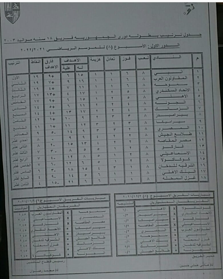 وكانت نتائج مباريات الجولة الثامنة لمسابقة دوري الجمهورية للناشئين مواليد 2003 بمشاركة أندية الدوري الممتاز شهدت التالي.