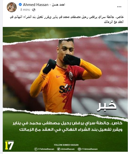 وكتب الصقر أحمد حسن تدوينة على الفيس بوك "خاص.. جالطة سراي يرفض رحيل مصطفى محمد في يناير ويقرر تفعيل بند الشراء النهائي في العقد مع الزمالك"