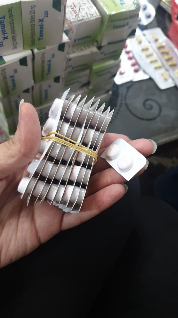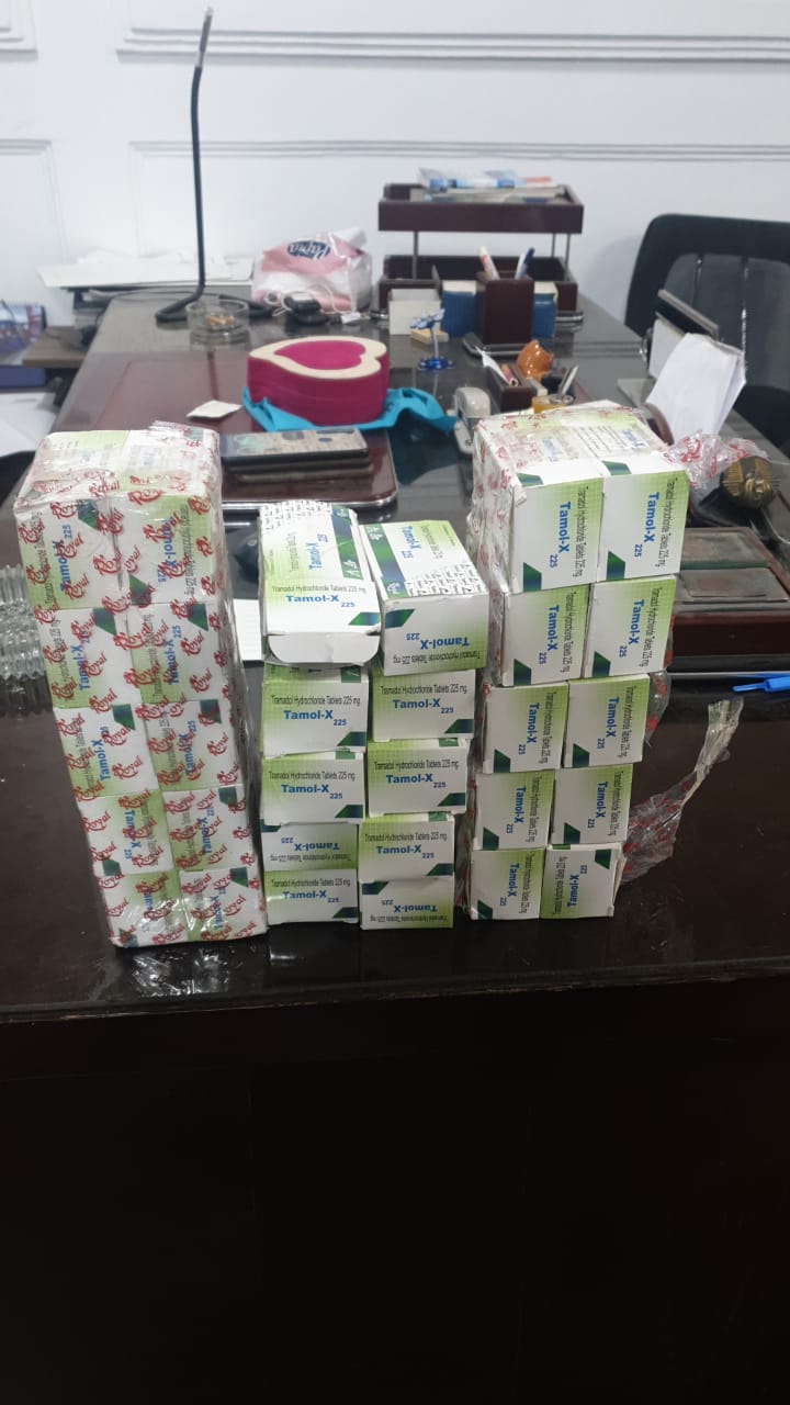 وبتفتيش الصيدلي بمعرفة قوة المباحث عثر على 100 قرص تامول إكس ٢٢٥ مجم، وبتفتيش السيارة الخاصة به تم العثور على، 600 قرص تامول 225 مجم وهي ادوية مهربة وغير مسجلة بوزارة الصحة المصرية ومدرجة بالقسم الثاني من الجدول (1) الملحق بقانون مكافحة المخدرات.