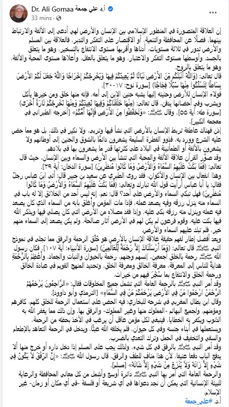وكتب علي جمعة تدوينة على حسابه بالفيس بوك "إن العلاقة المتصورة في المنظور الإسلامي بين الإنسان والأرض لهي أدعى إلى الألفة والارتباط بينهما، فضلًا عن المحافظة والتنمية، أو الاقتصار على التفكر والتدبر، فالعلاقة بين المسلم والأرض تدور في ثلاثة مستويات، أدناها وأقربها مستوى الانتفاع بالتسخير، وهو ما يتعلق بالجسد، وأوسطها مستوى التفكر والاعتبار، وهو ما يتعلق بالعقل، وأعلاها مستوى المحبة والألفة، وهو ما يتعلق بالروح".