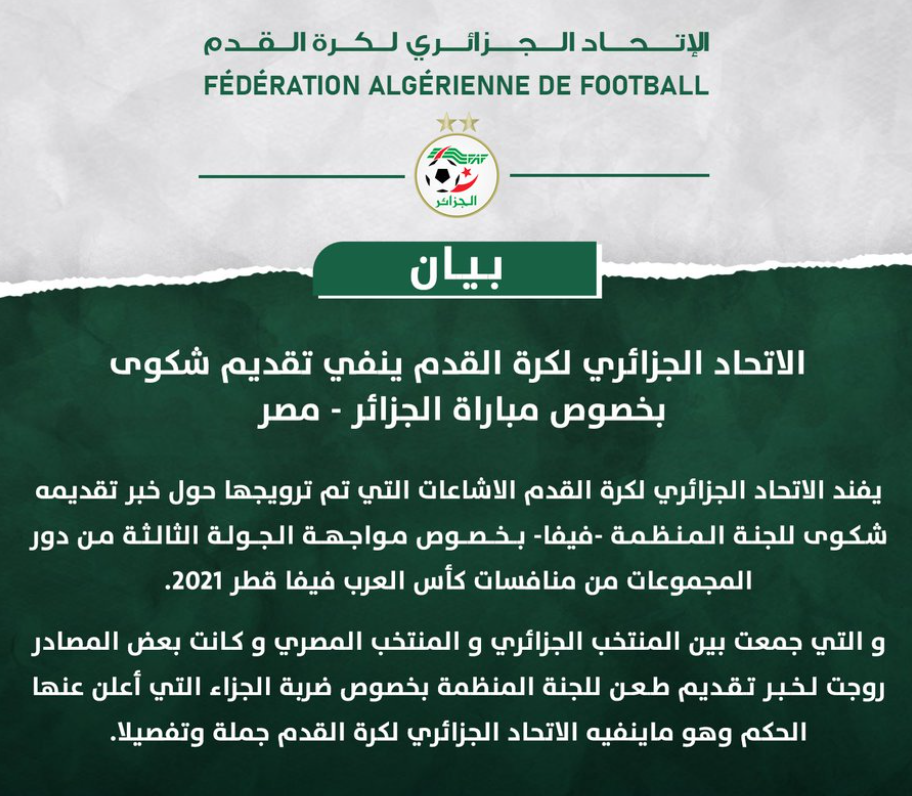 وقال الاتحاد الجزائري في بيان رسمي إنه ينفي تماما ما تم تناوله حول تقديم احتجاج حول ركلة الجزاء التي جاء منها هدف منتخب مصر خلال المباراة وان كل هذه الأنباء عارية تمام عن الصحة.