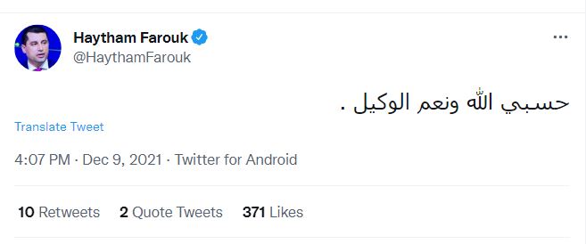 وكتب هيثم فاروق على صفحته الشخصية على تويتر: «حسبي الله ونعم الوكيل»، وذلك بعد ساعات من نشر صورة له مع أبو تريكة وأحمد حسن وعبد الستار صبري وياسر الشنواني.