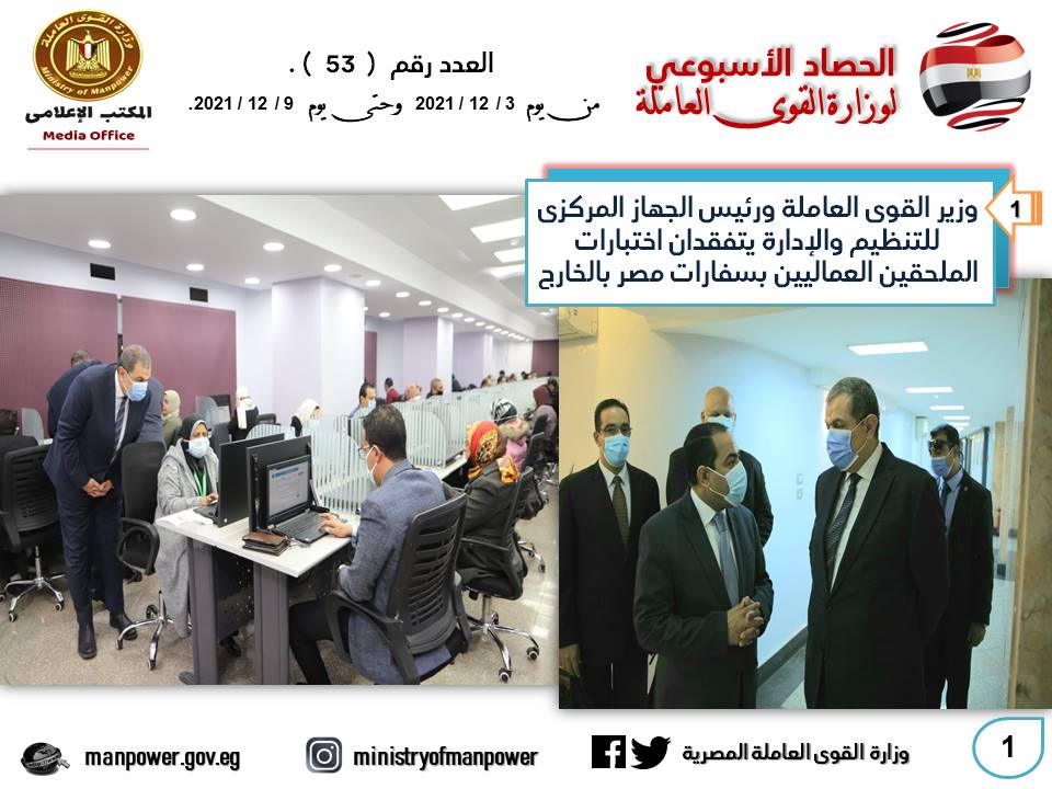 شهد حصاد الأسبوع الحالي، في وزارة القوى العاملة العديد من الأحداث المهمة خلال الفترة - من 3 إلى 9 ديسمبر الجاري- منها تفقد وزير القوى العاملة ورئيس الجهاز المركزي للتنظيم والإدارة الدكتور صالح الشيخ، بمركز تقييم القدرات والمسابقات التابع للجهاز، اختبارات المتقدمين على وظيفتي ملحق عمالي أول وثان بمكاتب التمثيل العمالي.