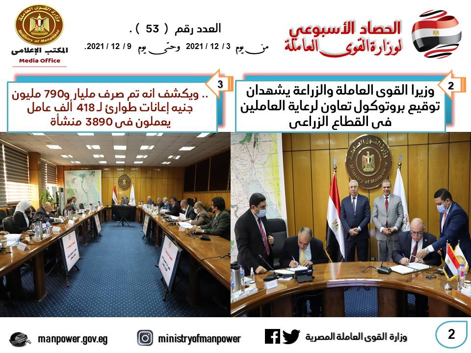 كما شهد وزير القوى العاملة، ووزير الزراعة واستصلاح الأراضي الدكتور السيد القصير، مراسم توقيع بروتوكول تعاون بين الوزارتين في مجال حماية ورعاية العاملين في القطاع الزراعي "صغار الصيادين والمزارعين".