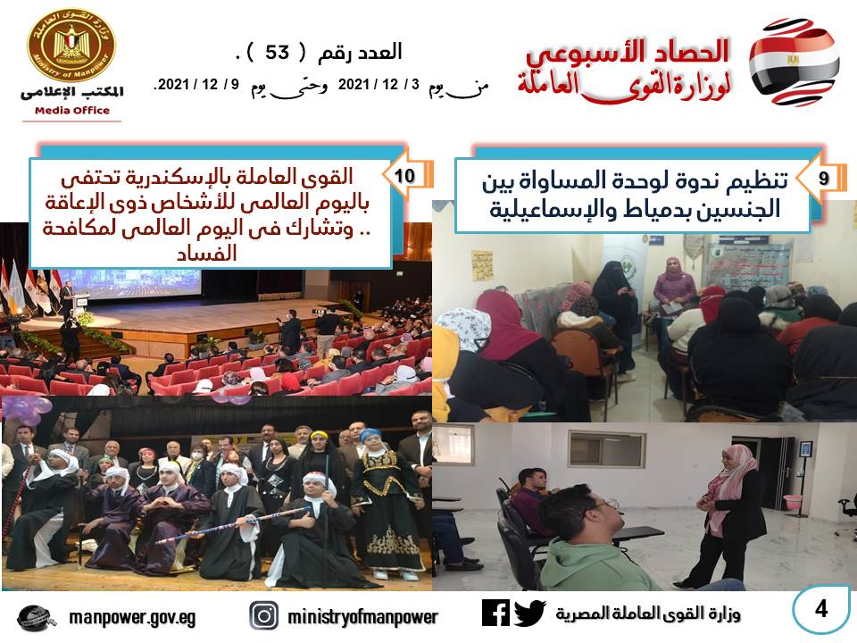 ونظمت مديرية القوى العاملة بالإسماعيلية ندوة بشركتي البتراء للملابس الجاهزة، وشركة جيد للملابس الجاهزة بالمنطقة الحرة العامة بالمحافظة طبقا للإعلان العالمي لمناهضة العنف والاعلان العالمى لحقوق الإنسان، وذلك ضمن سلسلة ورش العمل التي بدأتها وحدة المساواة بين الجنسين بالمديرية لنشر ثقافة العمل الآمن وكيفية تأمين بيئة العمل وتعزيز فرص المرأة ومساندتها والتعريف بالوحدة وأهدافها وتمكينها إقتصاديًا.