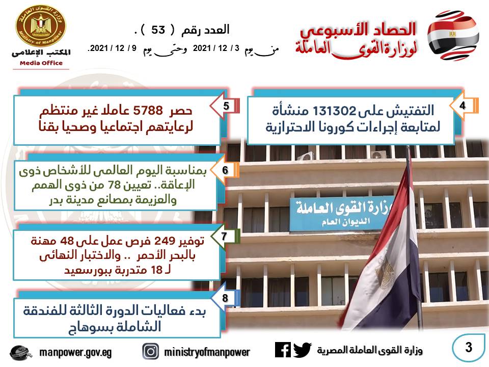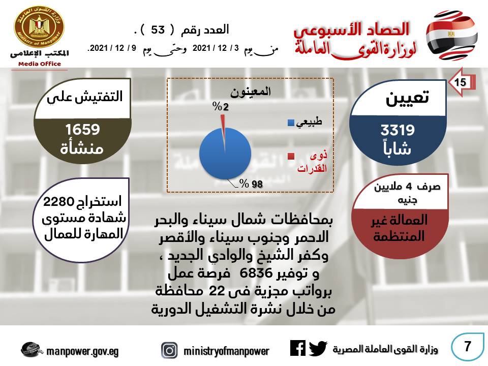 وشمل حصاد الأسبوع تعيين 3319 شابا في 6 محافظات، وصرف منح للرعاية الاجتماعية والصحية للعمالة غير المنتظمة المسجلة بمديريات القوى العاملة بمحافظات شمال سيناء، وكفر الشيخ، والبحر الأحمر، وجنوب سيناء، والأقصر، والوادي الجديد ، بلغت 4 ملايين و74 ألفًا و313 جنيها، والتفتيش على 1659 منشأة لتطبيق أحكام القانون، فضلًا عن استخراج 2280 شهادة قياس مستوى المهارة، ورخصة مزاولة الحرفة لـ 2280 عاملا.