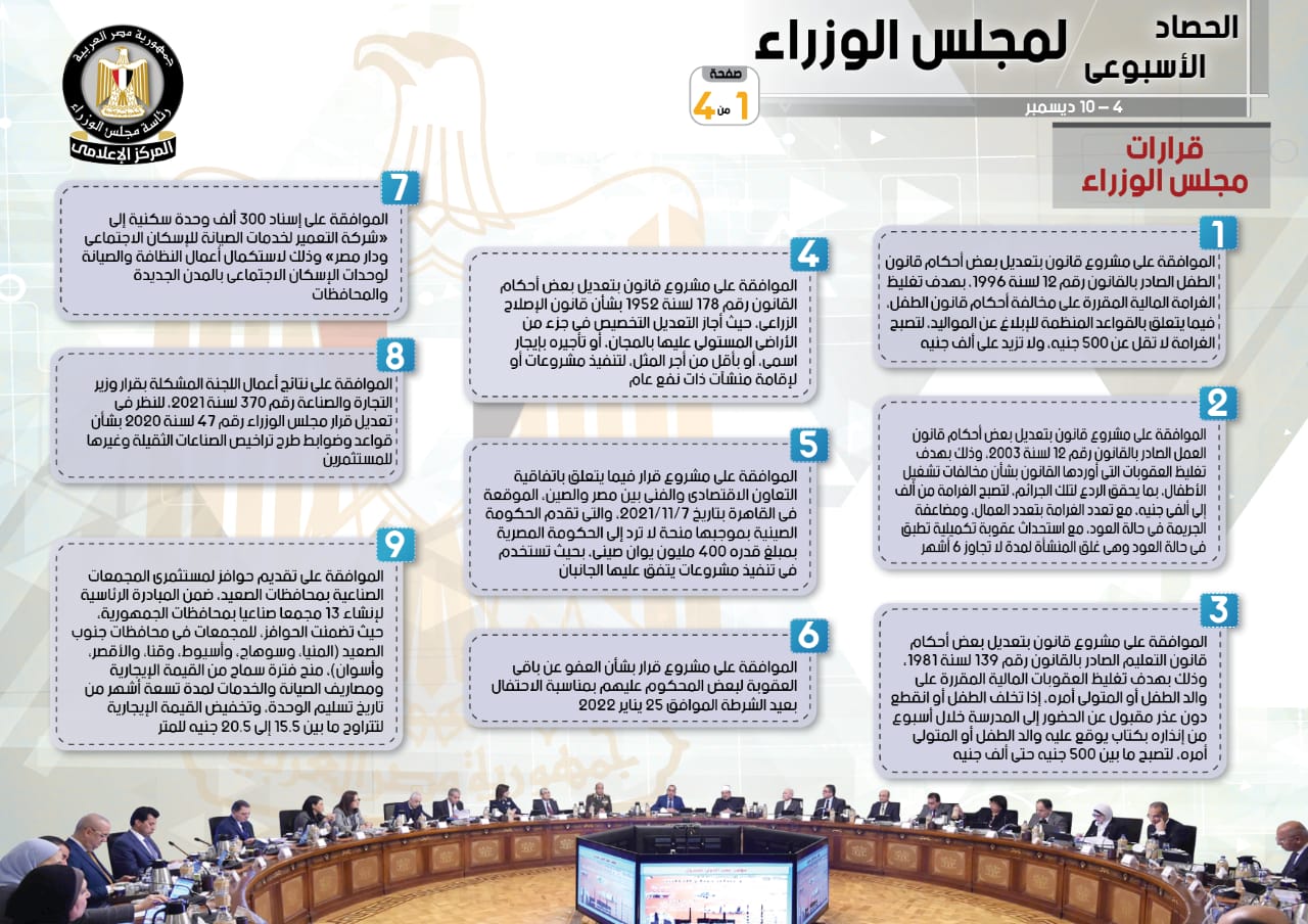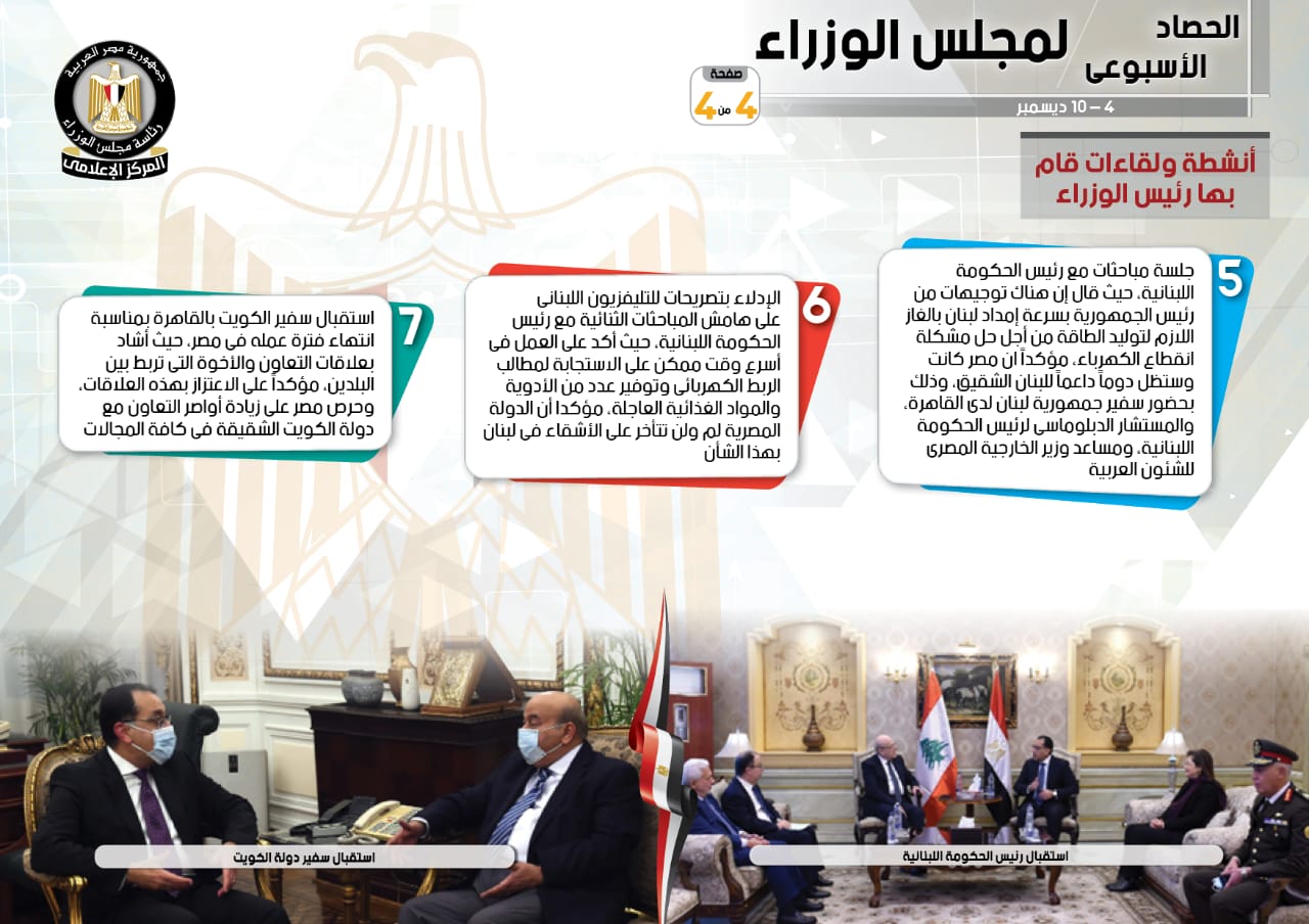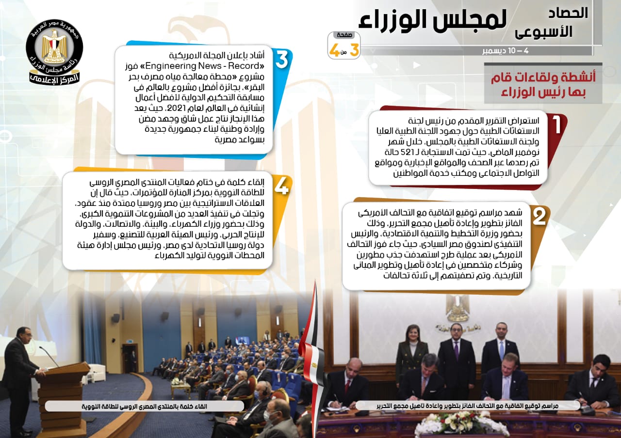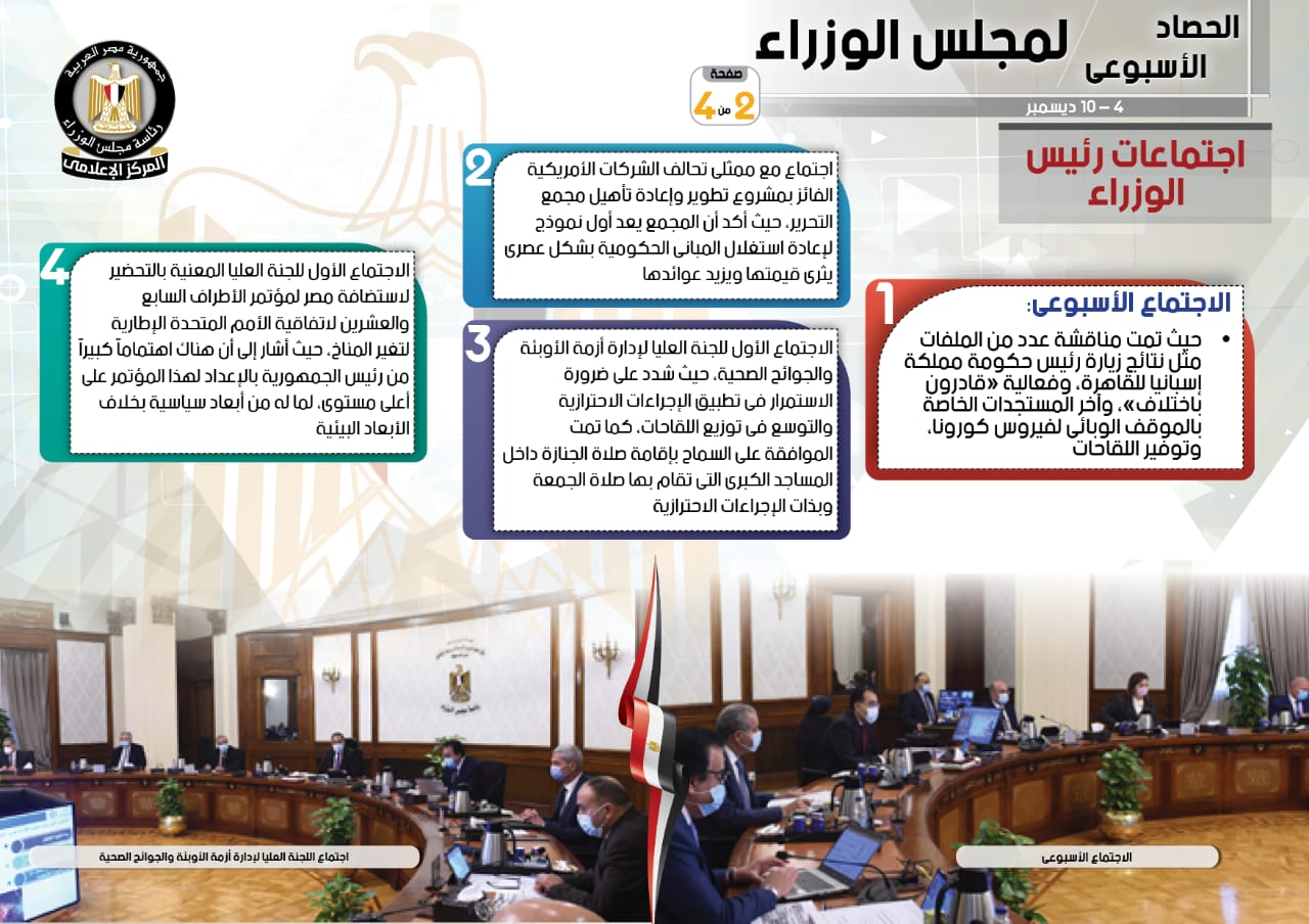نشر المركز الإعلامي لمجلس الوزراء، تقريرًا شمل إنفوجرافات سلط من خلالها الضوء على الحصاد الأسبوعي لمجلس الوزراء، وذلك خلال الفترة من4 حتى 10 ديسمبر 2021، والذي تضمن الموافقة على عدد من القرارات، فضلًا عن الاجتماعات التي عقدها الدكتور مصطفى مدبولي، رئيس مجلس الوزراء، بالإضافة إلى ما قام به من أنشطة.