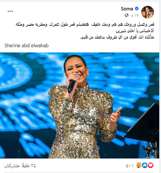 وكتبت سوما على صفحتها الرسمية على "فيس بوك": "قمر وعسل وروحك هي هي ودمك خفيف هتفضلي قمر طول عمرك.. ومطربة مصر وملكة الإحساس يا أحلي شيرين، متأكدة أنك أقوى من أي ظروف بدعمك من قلبي".