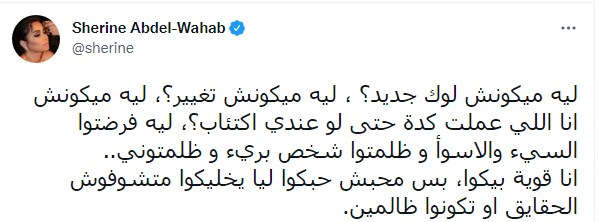 وكانت شيرين عبد الوهاب علقت على الشكل الجديد الذي ظهرت به على جمهورها وهي حليقة الرأي فقالت عبر حسابها على تويتر: "ليه ميكونش لوك جديد؟، ليه ميكونش تغيير؟، ليه ميكونش انا اللي عملت كدة حتى لو عندي اكتئاب؟، ليه فرضتوا السيء والاسوأ وظلمتوا شخص بريء وظلمتوني.. انا قوية بيكوا، بس محبش حبكوا ليا يخليكوا متشوفوش الحقايق او تكونوا ظالمين"