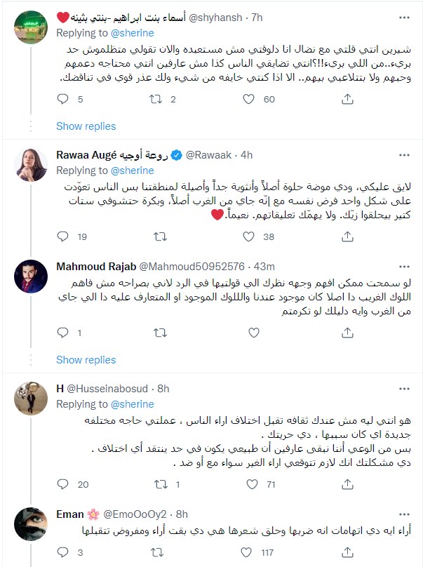 أما حسين أبو السعود فقال "هو انتي ليه مش عندك ثقافه تقبل اختلاف اراء الناس، عملتي حاجه مختلفه جديدة اي كان سببها، دي حريتك. بس من الوعي أننا نبقى عارفين أن طبيعي يكون في حد ينتقد أي اختلاف. دي مشكلتك انك لازم تتوقعي اراء الغير سواء مع أو ضد"