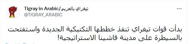 وكتبت تيجراي بالعربي تغريدة على تويتر "بدأت قوات تيغراي تنفذ خططها التكتيكية الجديدة واستفتحت بالسيطرة على مدينة قاشينا الاستراتيجية!"