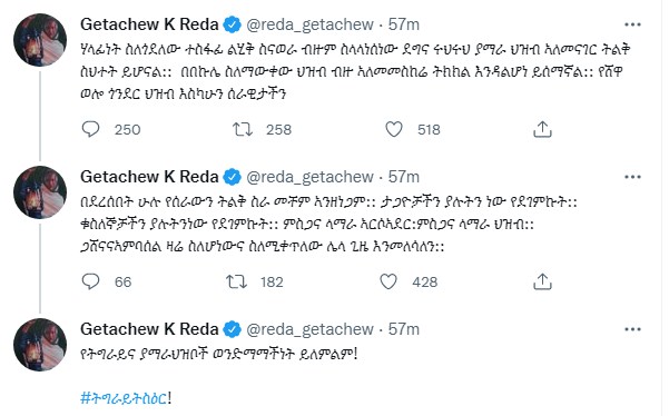 وتابع جياتشو رضا "سنعود إلى قاشينا وأمباسال اليوم ولفترة أخرى. لتزدهر الأخوة بين أهل تيجراي وأهل الأمهرة!"