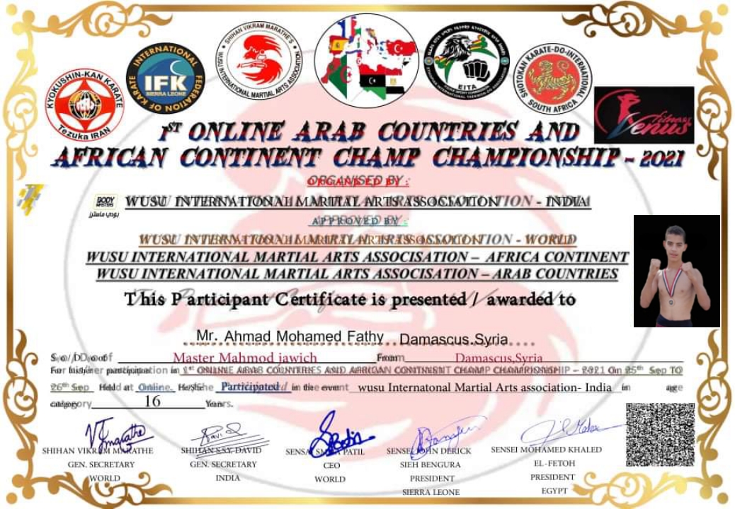 ولم تتوقف نجحات ابن قرية المعصرة إلى هذا الحد بل حصل على المركز الأول في بطولة الوطن العربي للألعاب القتالية تلك البطولة التي كانت تجمع أكثر من 400 لاعب من مختلف الجنسيات العربية.