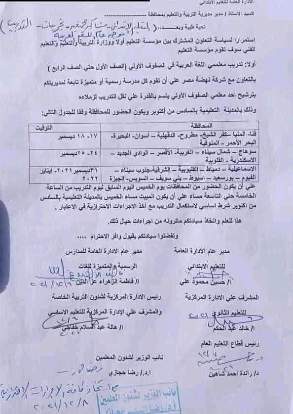 أرسلت وزارة التربية والتعليم والتعليم الفني، خطابا إلى جميع المديريات التعليمية بشأن تدريب معلمي اللغة العربية بمنظومة التعليم الجديدة للصفوف من الأول الابتدائي وحتى الصف الرابع الابتدائي على مستوى الجمهورية بالمدينة التعليمية بالسادس من أكتوبر.