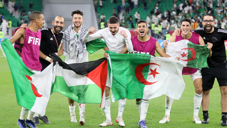 لاعبو المنتخب الجزائري يرفعون أعلام فلسطين بعد تأهلهم لنصف نهائي كأس العرب