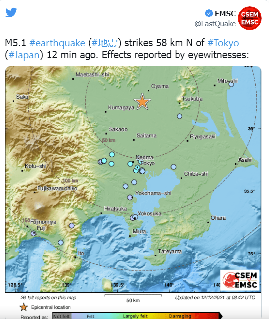 وكانت إدارة الكوارث اليابانية، قد أعلنت مؤخرا، أن 32 شخصًا جرحوا في الزلزال الذي ضرب منطقة طوكيو، وقدرت وكالة الأرصاد الجوية في البلاد قوته بـ6.1 درجة.