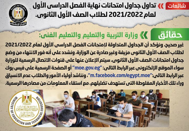 وتواصل المركز الإعلامي لمجلس الوزراء مع وزارة التربية والتعليم والتعليم الفني، والتي نفت تلك الأنباء، مُؤكدةً أنه لا صحة للجداول المتداولة عن امتحانات نهاية الفصل الدراسي الأول لعام 2021/ 2022 لطلاب الصف الأول الثانوي، وأن الجداول المتداولة لامتحانات الفصل الدراسي الأول لعام 2021/2022 لطلاب الصف الأول الثانوي مزيفة وغير صادرة عن الوزارة.