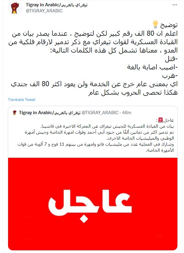 وأوضحت تيجراي بالعربي عبر تويتر "توضيح.. اعلم ان 80 الف رقم كبير لكن لتوضيح، عندما يصدر بيان من القيادة العسكرية لقوات تيجراي مع ذكر تدمير لارقام فلكية من العدو، معناها تشمل كل هذه الكلمات التالية: -قتل -اصيب اصابة بالغة –هرب.. اي بمعنى عام خرج عن الخدمة ولن يعود أكثر 80 الف جندي هكذا تحصى الحروب بشكل عام".