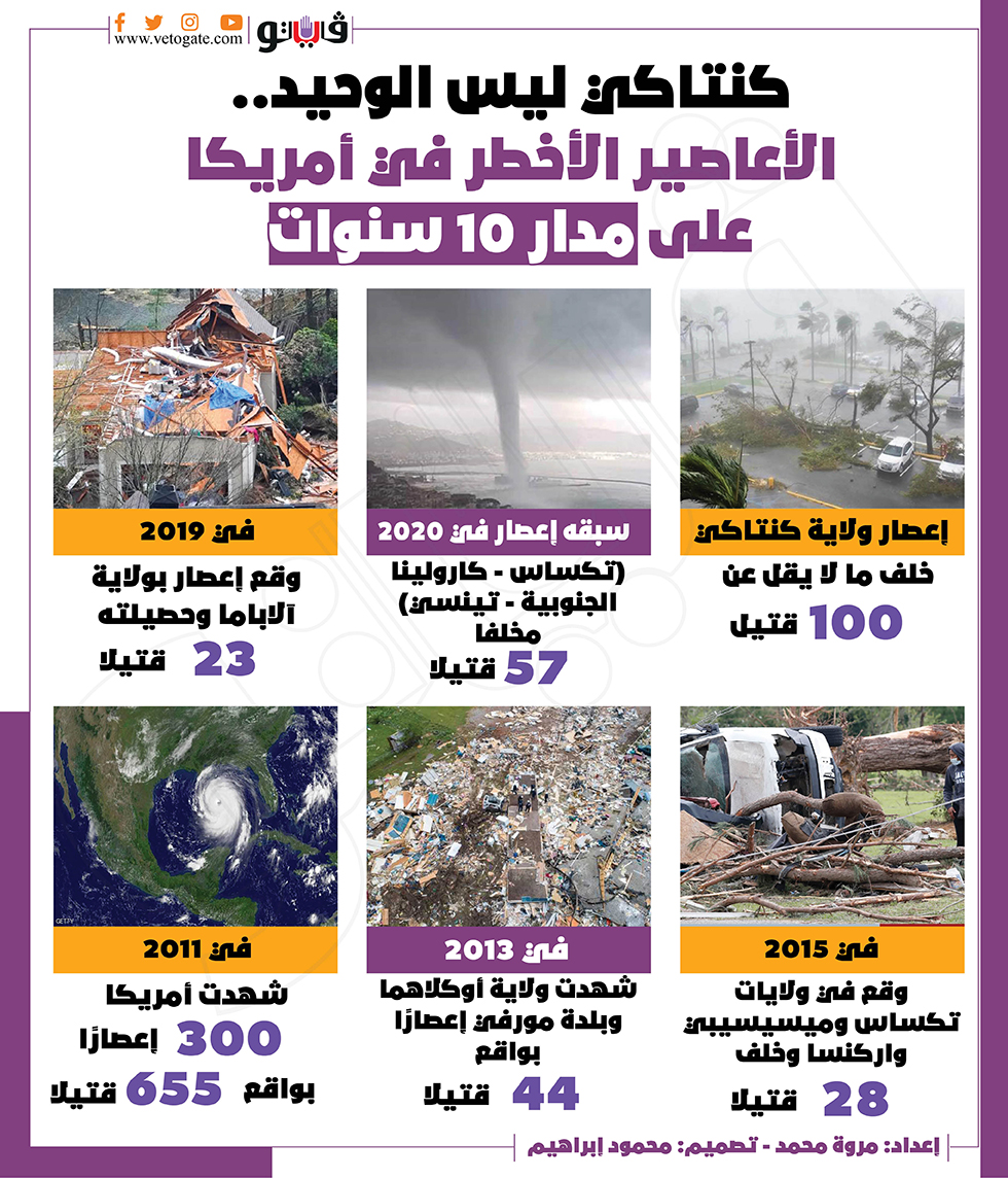 كنتاكي ليس الوحيد.. الأعاصير الأخطر في أمريكا على مدار 10 سنوات | إنفوجراف الثلاثاء 14/ديسمبر/2021 - 10:30 م 12/14/2021 10:30:21 PM إعصار مروة محمد شارك طباعة 18 حجم الخط شارك طباعة كنتاكي إعصار ولاية كنتاكي تكساس كارولينا الجنوبية إعصار تينيسي