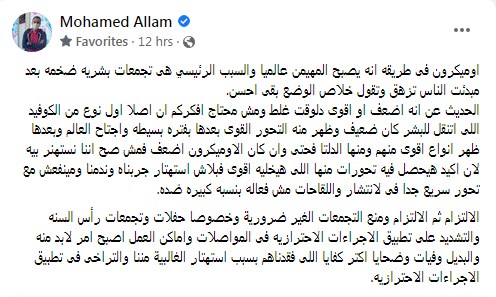 وكتب محمد علام تدوينة على الفيس بوك "اوميكرون فى طريقه انه يصبح المهيمن عالميا والسبب الرئيسي هى تجمعات بشريه ضخمه بعد ما بدأت الناس تزهق وتقول خلاص الوضع بقى أحسن".