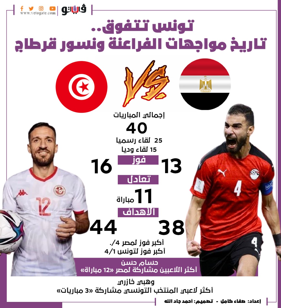 تونس تتفوق.. تاريخ مواجهات الفراعنة ونسور قرطاج |إنفو جراف الثلاثاء 14/ديسمبر/2021 - 04:41 م 12/14/2021 4:41:48 PM منتخب مصر صفاء كامل شارك طباعة 18 حجم الخط شارك طباعة منتخب تونس مصر تاريخ مواجهات مصر وتونس