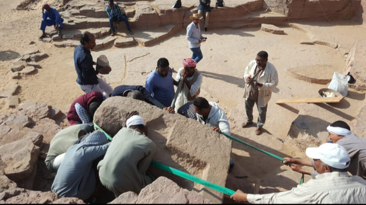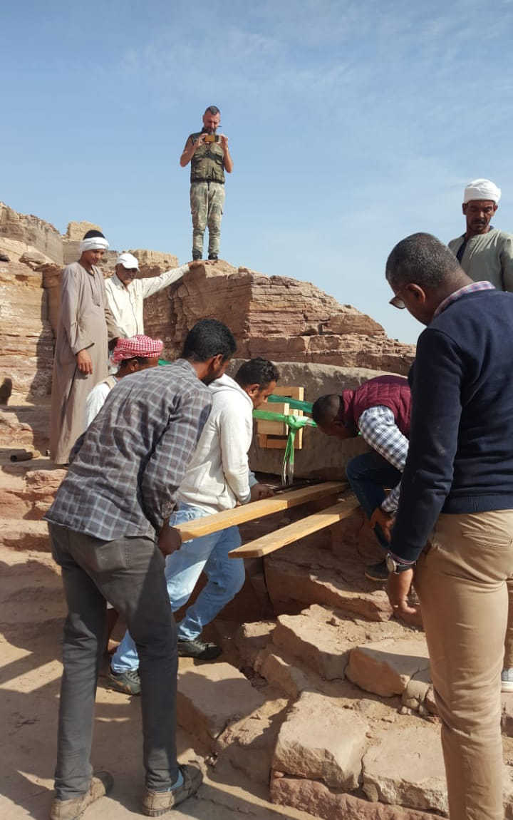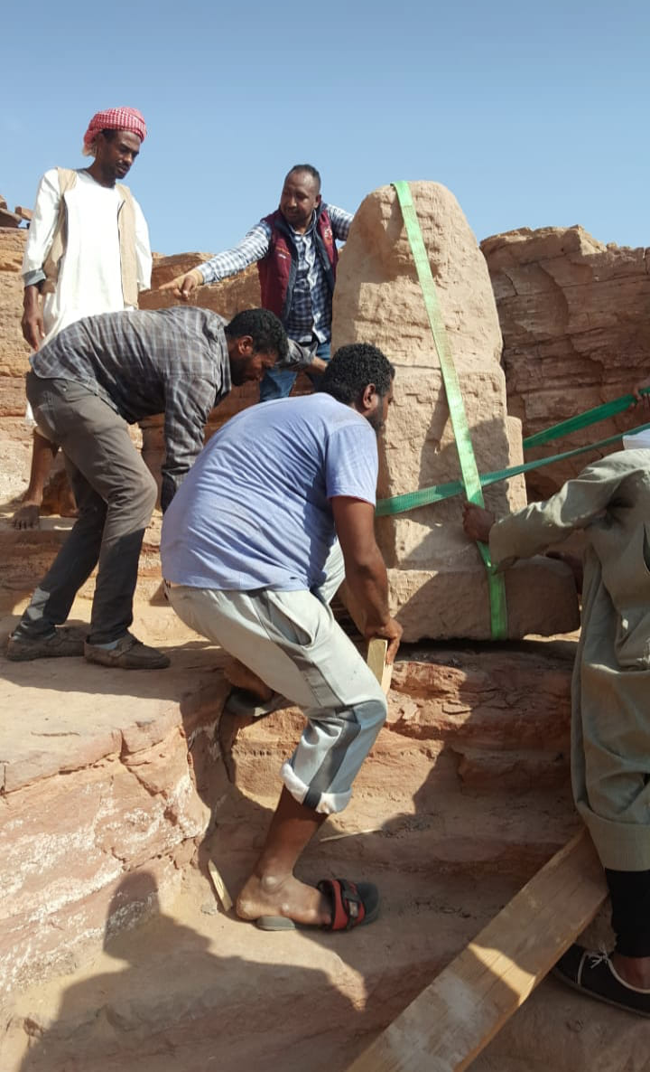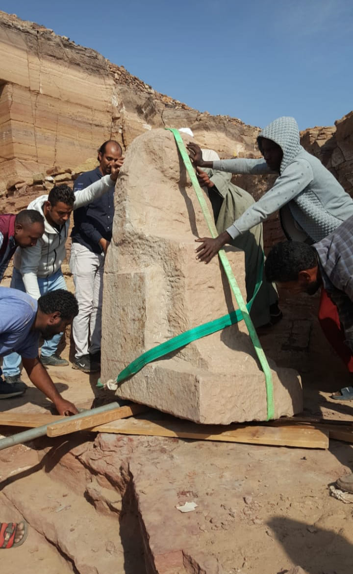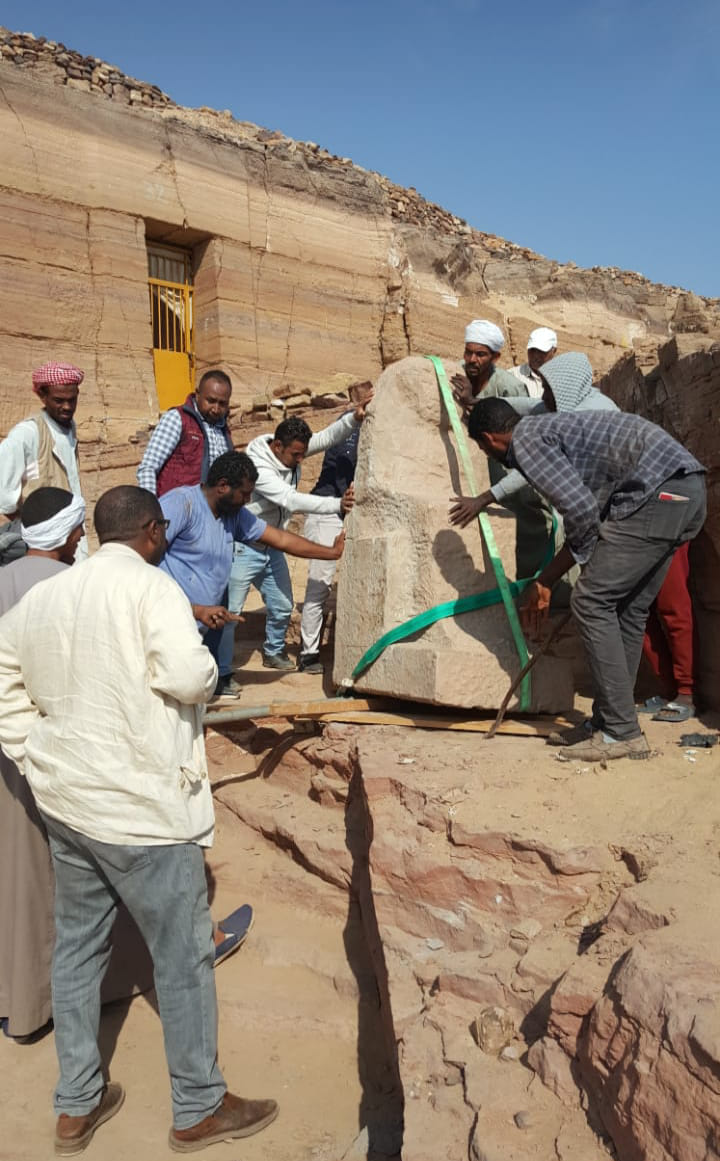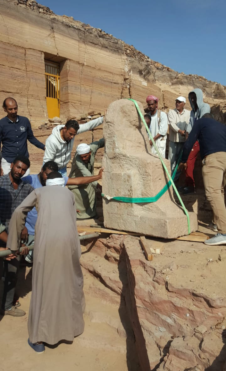 قام فريق عمل من المرممين والعمال بمنطقة آثار أسوان برئاسة شاذلي علي مدير عام آثار أسوان صباح اليوم باستعدال تمثال منحوت من الحجر الرملي وغير مكتمل الملامح ربما كان خاص بالأمير سارنبوت صاحب أحد أهم المقابر بقبة الهواء.